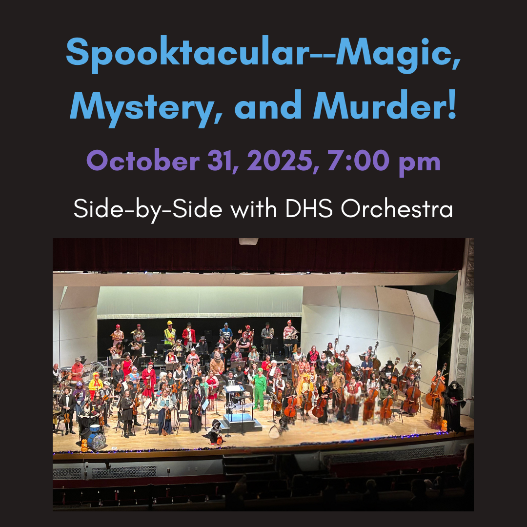 Join the Danville Symphony Orchestra and Danville High School Orchestra Halloween Night for our 2nd annual Spooktacular concert! Come in costume, enjoy some treats, and help figure out who the murderer is in The Composer is Dead, a fun, interactive piece by Nathaniel Stookey with text by Lemony Snicket. Other pieces that will be performed are Charles Gounod’s The Funeral March of a Marionette, J.S. Bach’s Toccata and Fugue in D minor, Lin-Manuel Miranda’s Selections from Encanto, and Modest Mussorgsky’s Night on Bald Mountain.